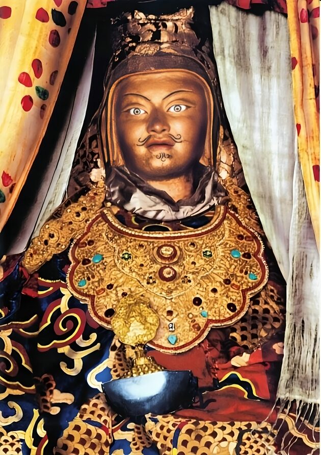 Juntament amb Jamyang Khyentse Chökyi Lodrö, Sogyal Rinpoche va realitzar cent mil ofrenes tsok enfront d’aquesta imatge quan van romandre en Samyé durant més d’un mes en el seu camí a l’Índia.