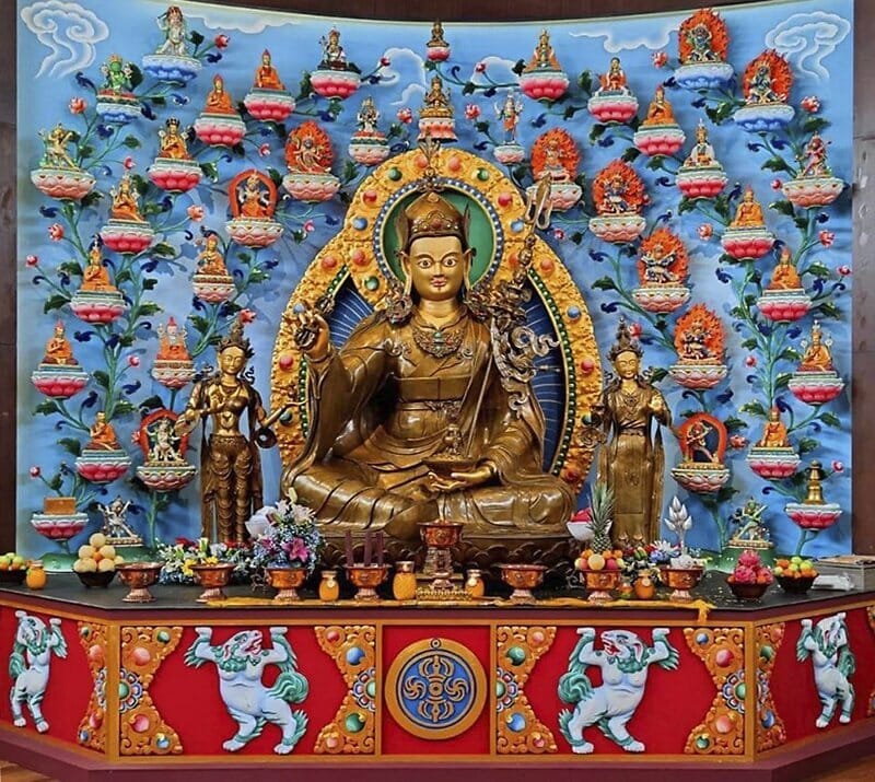 Padmasambhava, o Padmākara, com també se’l coneix, significa ‘Nascut del lotus’, en referència al naixement de Guru Rinpotxé d’un lotus a la terra d’Oddiyana. Guru Rinpotxé, el ‘Preuat Mestre’, és el fundador del budisme tibetà i el buddha del nostre temps. Arriba al Tibet a finals del s. VIII. Va tenir 25 deixebles principals que, en posteriors encarnacions van renéixer com a tertöns i van revelar ensenyances que Padmasambhava havia amagat per a beneficiar a la gent en temps esdevenidors.