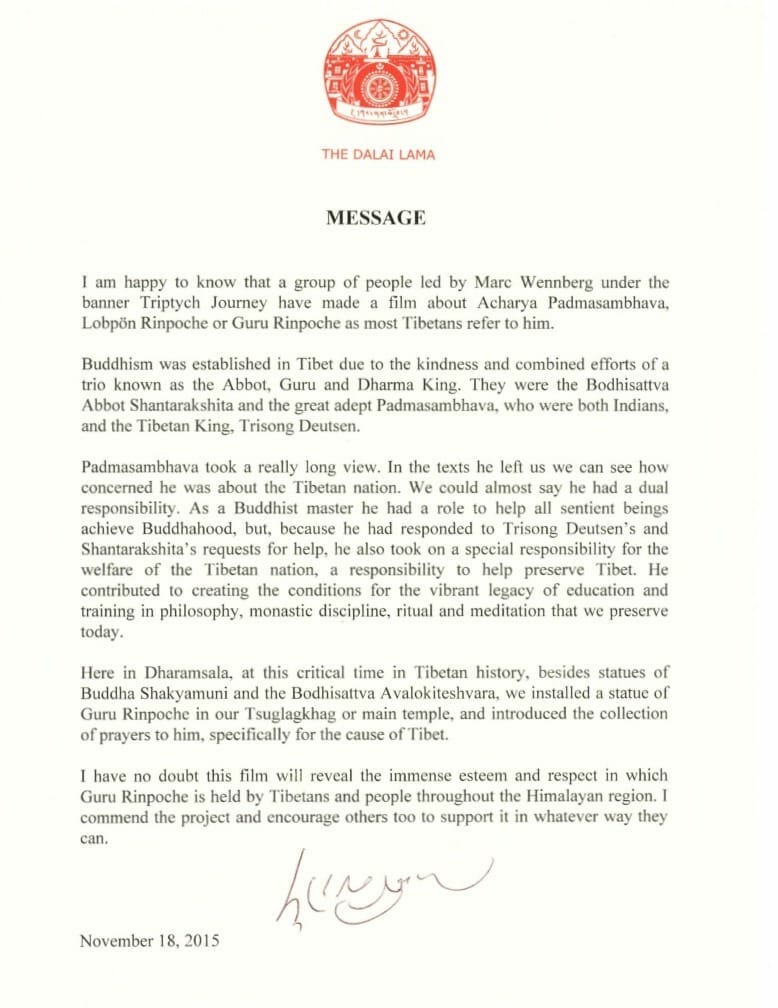 “M’alegra saber que un grup de persones liderat per Marc Wennberg sota la bandera de Triptych Journey han fet una pel·lícula sobre Achara Padmasambhava, Lobpön Rinpoche o Guru Rinpoche que és com li diuen la majoria de Tibetans.
