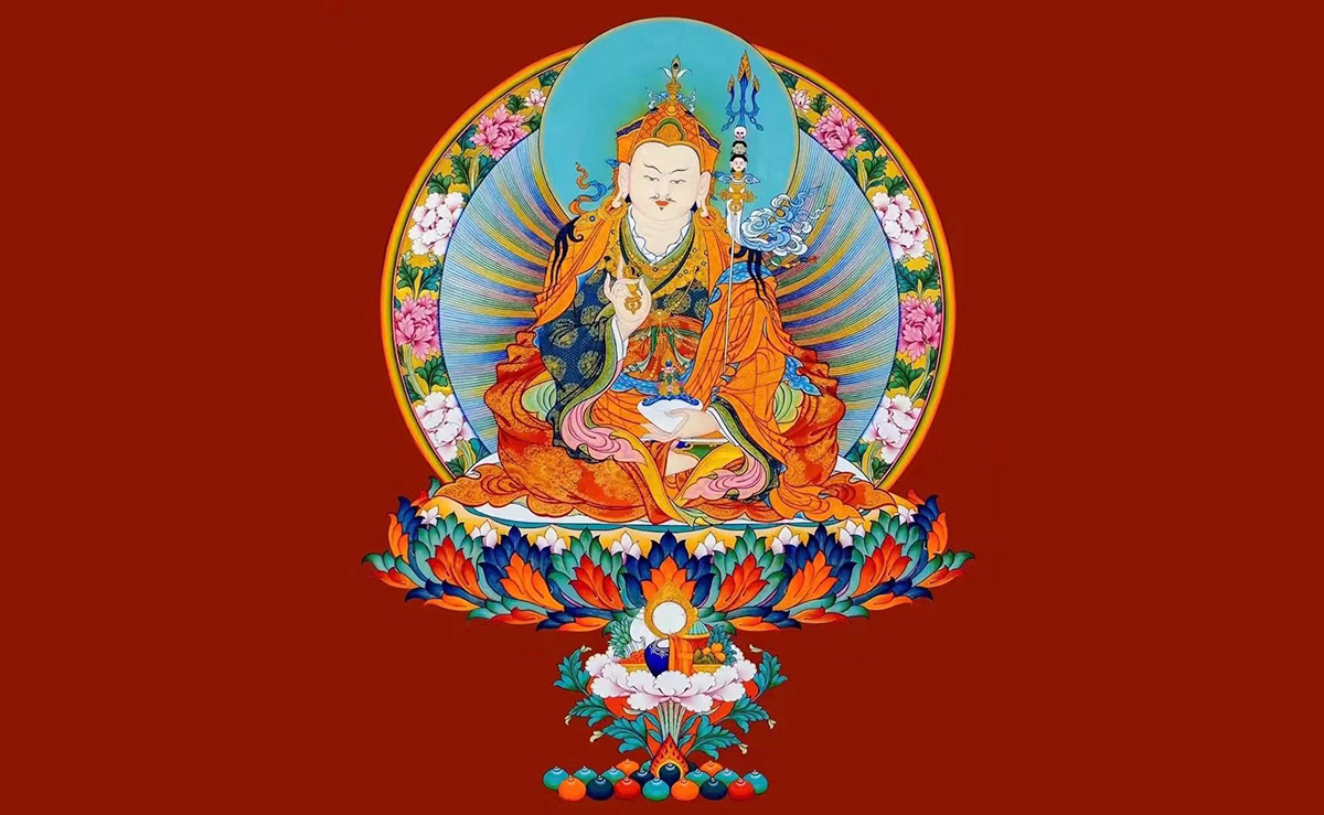 Guru Pema Jungne. Surgido del loto, el Salvador, que enseña el Dharma al pueblo. Aparece sentado en un loto, vestido con las tres túnicas de un monje, que viste una camiseta azul, pantalón y pesadas botas tibetanas como protección contra el frío. Posee el cetro de diamante del amor compasivo en su mano derecha y un cráneo-Bol del yogui de sabiduría clara en su izquierda. Tiene un tridente especial llamado khatvanga de un yogui errante y luce en su cabeza una corona de tela nepalí, estilísticamente diseñada para recordarle a uno la forma de una flor de loto. Por lo tanto, está representado como él debe haber aparecido en el Tíbet.