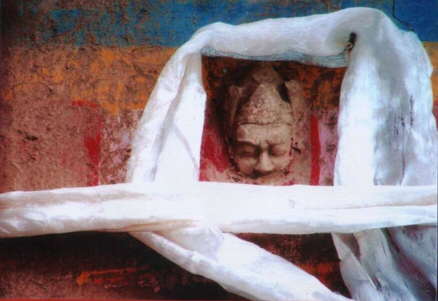 Esta foto especial muestra la cabeza del Glorioso Guru Padmasambhava como imagen auto-originada, esto es, que emerge de forma natural ya que literalmente crece más y más desde la pared.