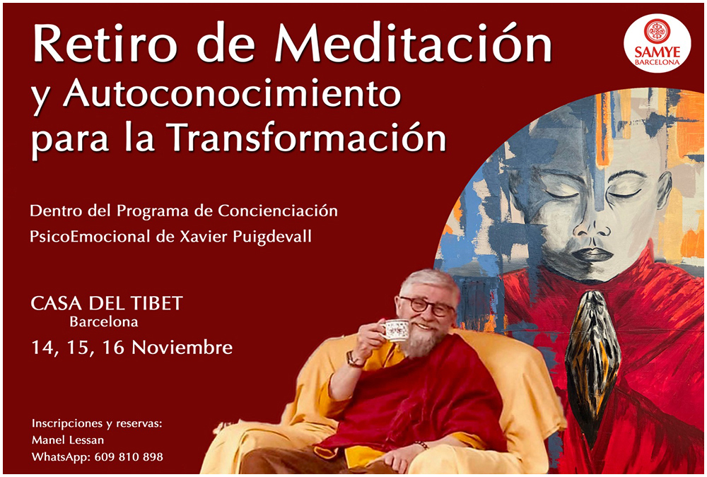 Basado en las indicaciones e instrucciones de su precioso maestro Phakchok Rinpoche, Xavier Puigdevall nos convoca a un nuevo retiro en Noviembre para profundizar en la observación de la meditación y de la mente dentro del programa de concienciación psico-emocional. Este programa es el fruto de los muchos años de experiencia en su propio viaje y en la función de ayuda al otro.